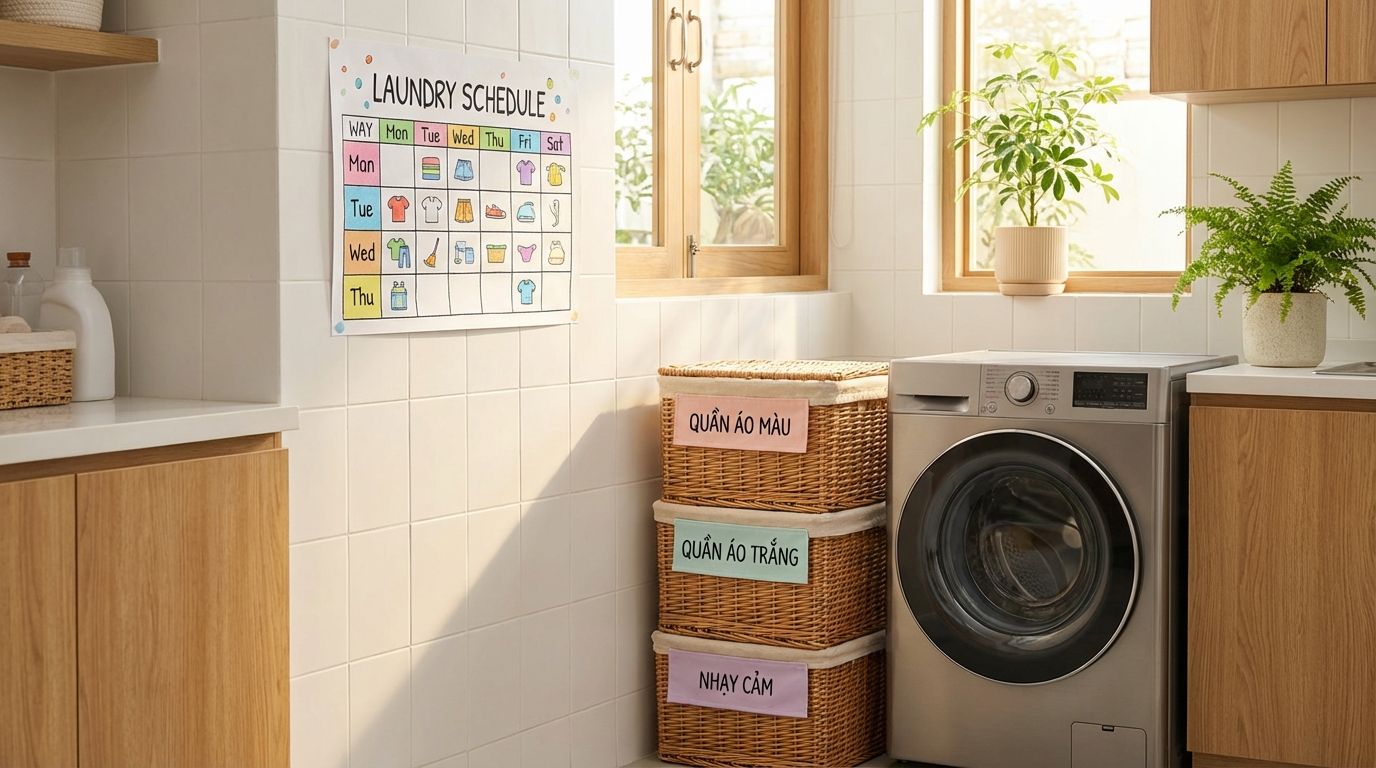 In hoặc viết tay nhãn: "Giặt giũ", "Bếp", "Phòng tắm" — dán lên thùng hoặc kệ. Khi người thân hoặc người giúp việc cần lấy đồ, họ biết ngay cần tìm ở đâu.