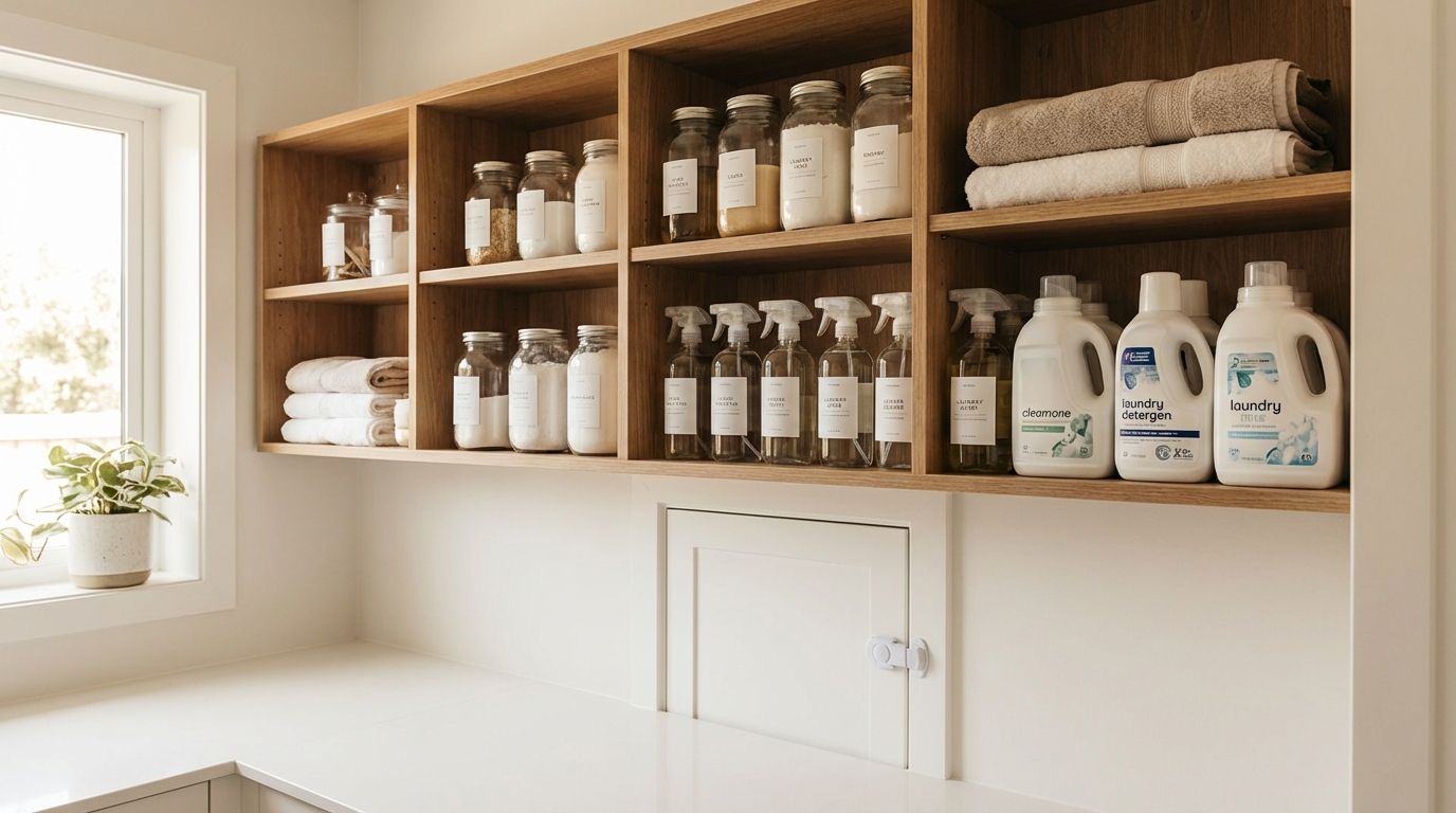 Từ hôm đó, mình sắp xếp lại tất cả — tủ cao, khóa trẻ em, nhãn rõ ràng. Nghe đơn giản nhưng thực ra 70% gia đình Việt Nam chưa lưu trữ hóa chất gia dụng đúng cách. Bài này là hướng dẫn mình ước có từ trước khi sinh con.
