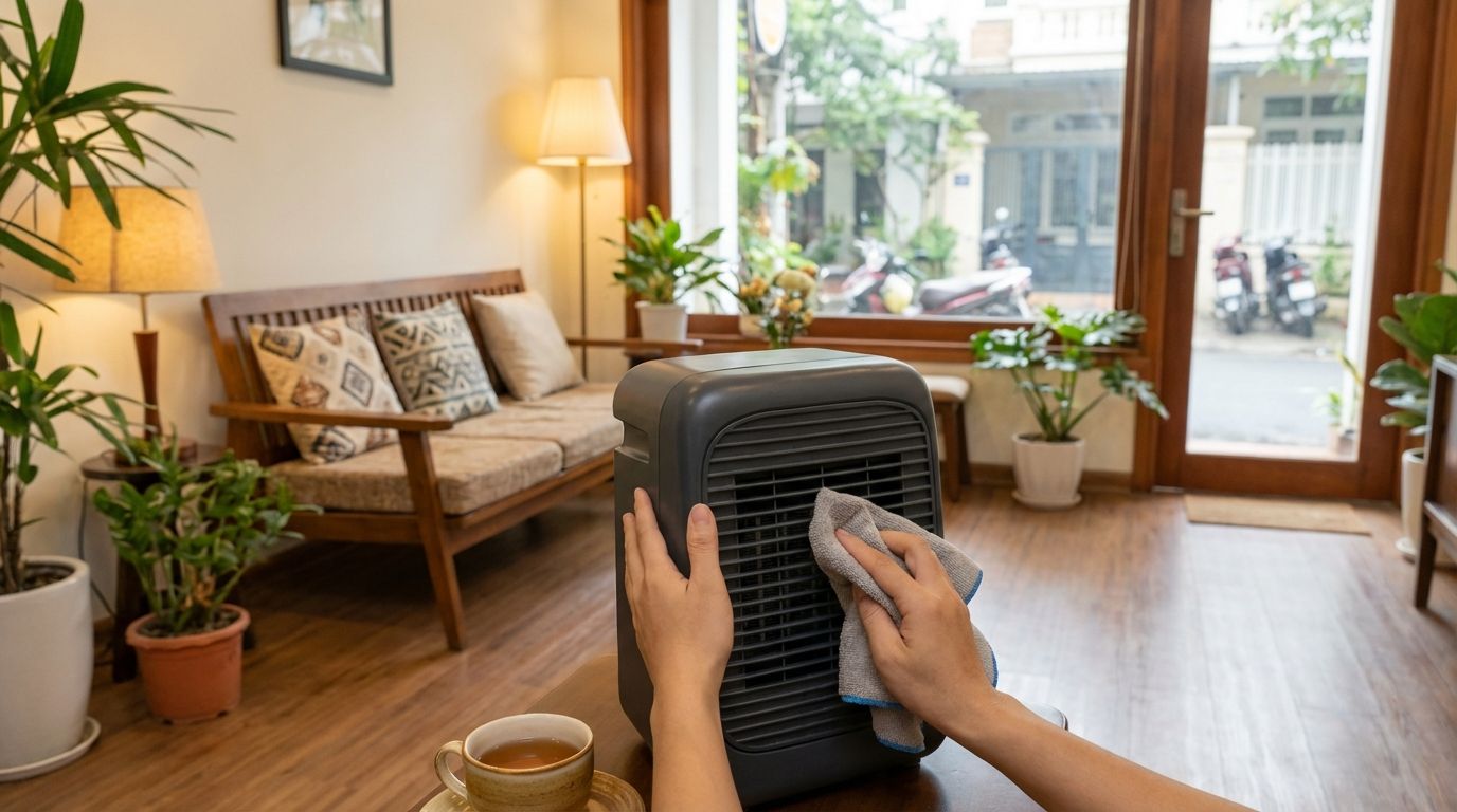 Chỉ cần 15 phút vệ sinh máy sưởi, quạt sưởi trước mùa đông: hút bụi, lau sạch, kiểm tra dây điện — an toàn, tiết kiệm điện, không bốc mùi khét.