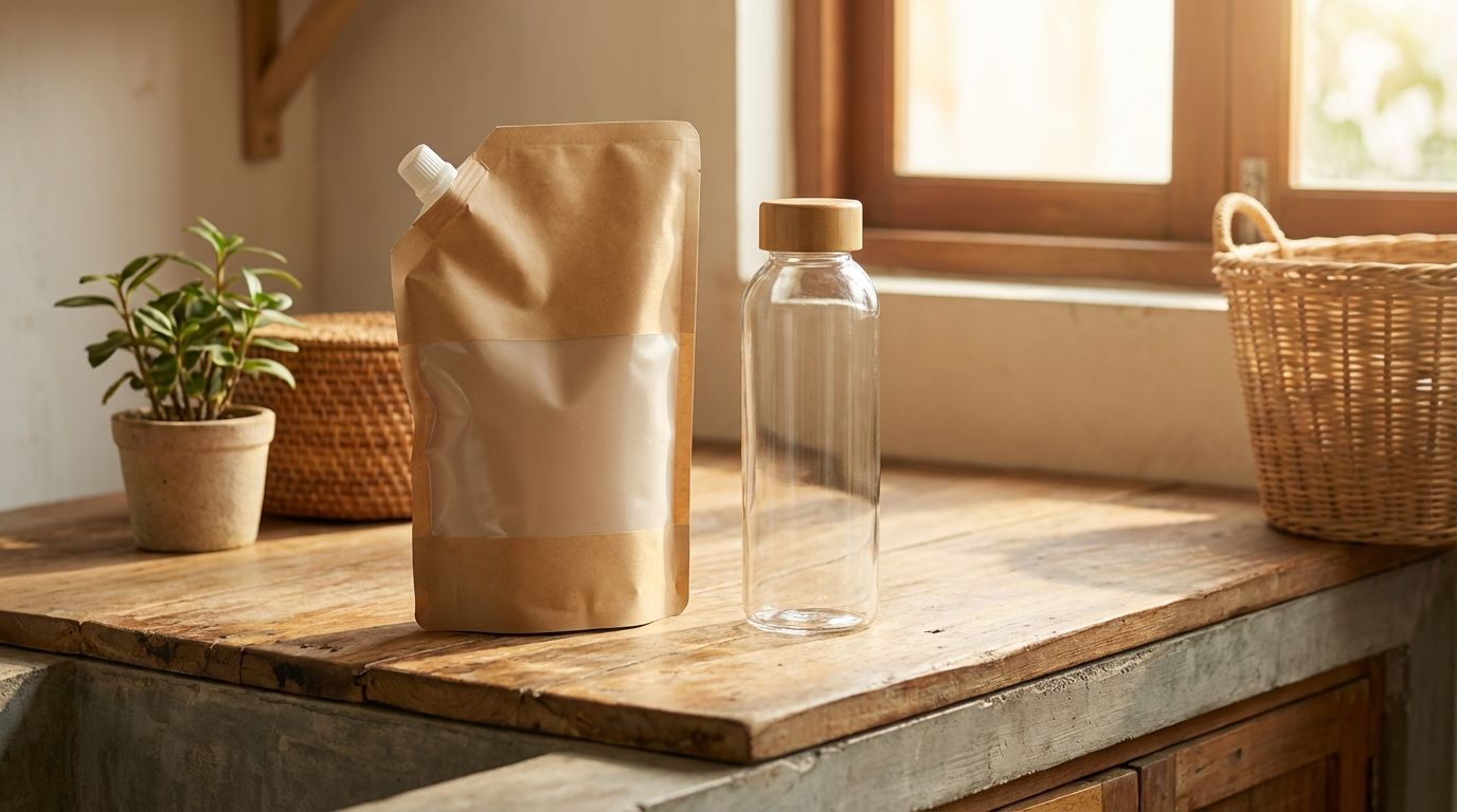 Chai nhựa cứng + nắp bơm + nhãn in màu = chi phí bao bì 8-15k mỗi chai. Túi mềm in đơn giản = 2-5k. Phần chênh lệch đó chính xác là tiền bạn tiết kiệm được khi chuyển sang refill.