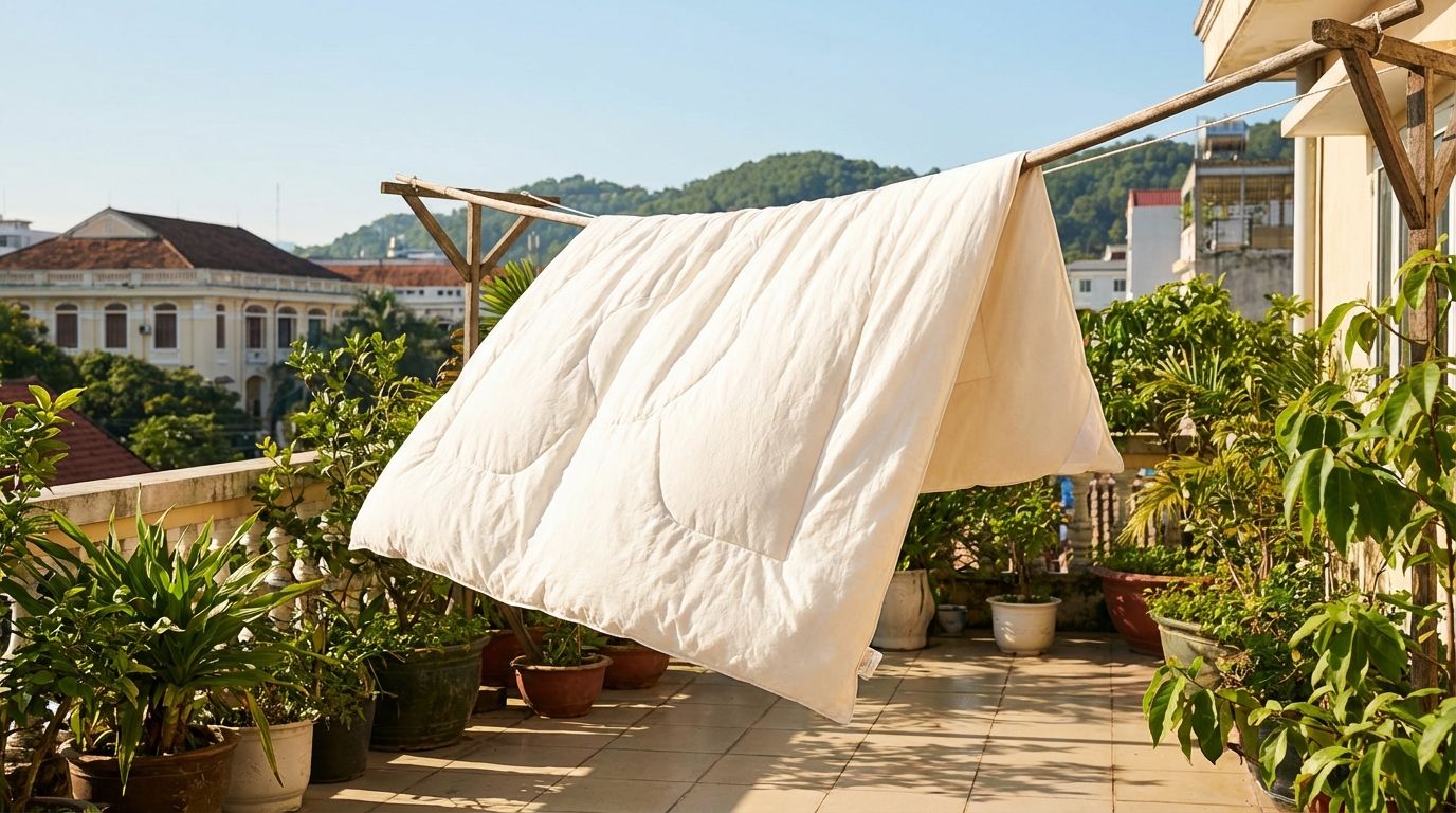 Hướng dẫn 6 bước giặt chăn bông bằng máy giặt tại nhà đơn giản, tiết kiệm. Kèm mẹo phơi phồng xốp và xử lý chăn vón cục sau giặt.