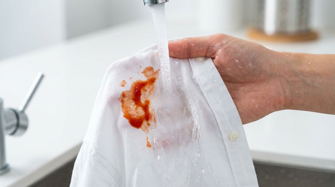 Hướng dẫn 4 bước tẩy vết nước sốt, sốt cà chua trên áo bằng nước rửa bát và baking soda. Mẹo phơi nắng UV tẩy màu đỏ cứng đầu không cần hóa chất.