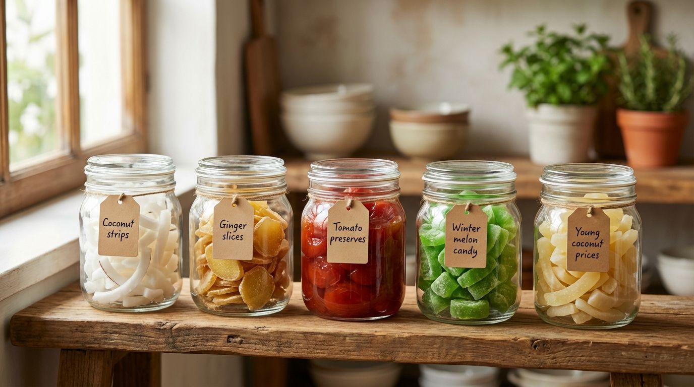 Top 5 loại mứt Tết dễ làm tại nhà: mứt dừa, mứt gừng, mứt cà chua, mứt bí, mứt dừa non. Nguyên liệu, công thức chi tiết và cách bảo quản an toàn.
