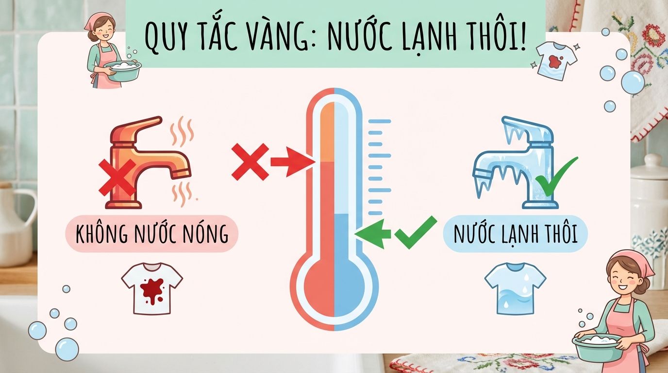 KHÔNG! Nhiệt độ trên 30°C đã bắt đầu làm protein trong máu đông lại. Nước ấm 40-50°C gần như "nấu chín" vết máu vào vải. Luôn dùng nước lạnh — nếu được thì nước đá lạnh càng tốt.